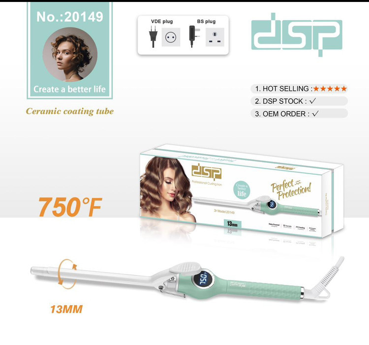 فر کننده مو dsp 20149، دارای 30 وات توان بوده که قادر است حرارت 750 فارنهایت تولید کند. این بابلیس دارای پوشش سرامیکی است که باعث انتقال حرارت بهتر روی مو و حالتدهی با ماندگاری بالا میشود. صفحههای سرامیکی این اتو مو، حرارت را به طور یکنواخت توزیع کرده و از سوختگی موها جلوگیری میکند. با توجه به ظرفیت گرمایی بالای سرامیک، صفحه سرامیکی گرمای خود را برای مدت طولانی حفظ میکند. همچنین این فرکننده مو دارای گرم کننده PTC است که با افزایش دما، میزان عبور جریان الکتریسیته را کاهش میدهد تا از داغ شدن بیش از اندازه صفحات اتو مو جلوگیری کند. این ویژگی مناسب افرادی است که موهای حساسی دارند و حرارت بالای اتو، به موهای آنها آسیب خواهد زد. سری این محصول در اندازه 13mm میتواند فرهای ریزی روی مو ایجاد کند. این محصول، فرکنندهای با کاربرد آسان و کیفیت بسیار عالی مناسب استفاده خانگی و همچنین سالنهای ارایشی است. طول سیم کالا 1/5 متری می باشد.