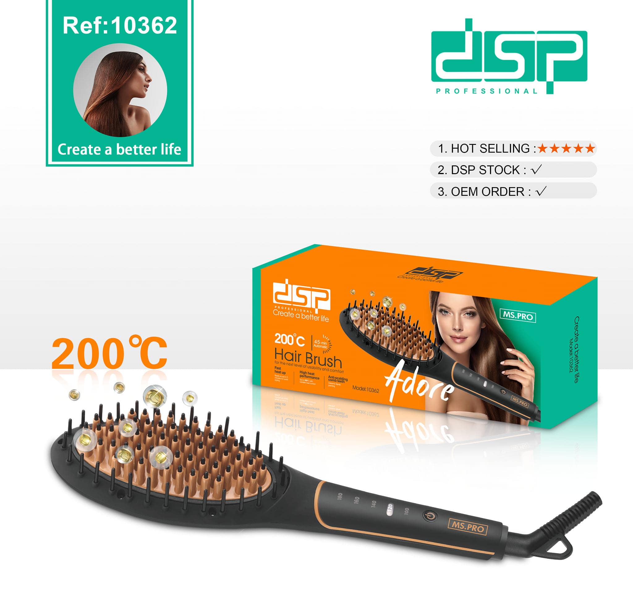برس حرارتی دی اس پی dsp 10362 مناسب برای انواع موها میباشد. این برس حرارتی کاملا حرفه ای میباشد. آرایشگران و سالندارها و حتی برای مصرف شخصی گزینه بسیار مناسبی میباشد، زیرا با یک بار کشیدن برس، موها را بدون هیچگونه آسیب رساندن صاف و مرتب میکند. بیشینه دمای این برس حرارتی 180درجه سانتی گراد میباشد. برس حرارتی دی اس پی dsp 10362 نه تنها یک اتو بلکه سشوار و ماساژور میباشد که هنگام کشیدن برس موها را کاملا ماساژمیدهد. صفحه این برس حرارتی از نوع سرامیکی میباشد، صفحه سرامیکی حرارت را به طور یکسان پخش میکند تا به موها هیچگونه آسیبی نرسد. ریزترین گره ها را از بین میبرد و موهای صاف و درخشان و طبیعی برای شما به ارمغان میآورد. برس حرارتی dsp 10362 دارای چراغ نشانگر میزان دما میباشد. این برس طراحی کاملا ارگونومیک را دارد یعنی بسیار خوش دست و مناسب کار میباشد که هنگام استفاده هیچگونه احساس خستگی نمیکنید. بدنه بسیار مقاوی را در برابر ضربات فیزیکی دارد
